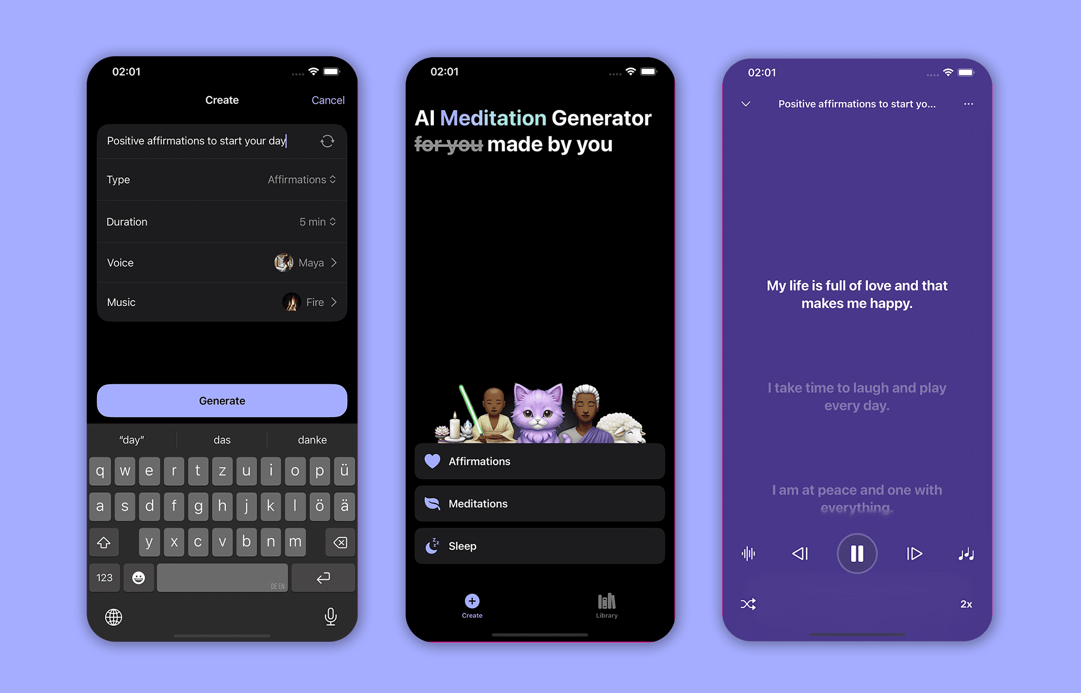 AI-powered audio sessions for affirmations, meditation...